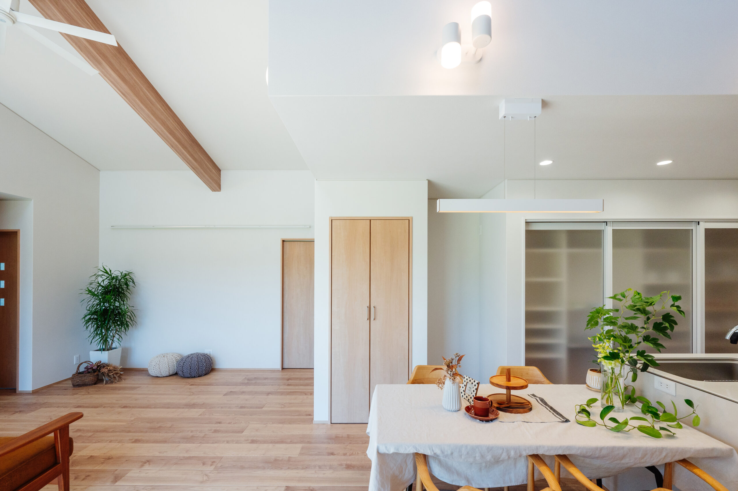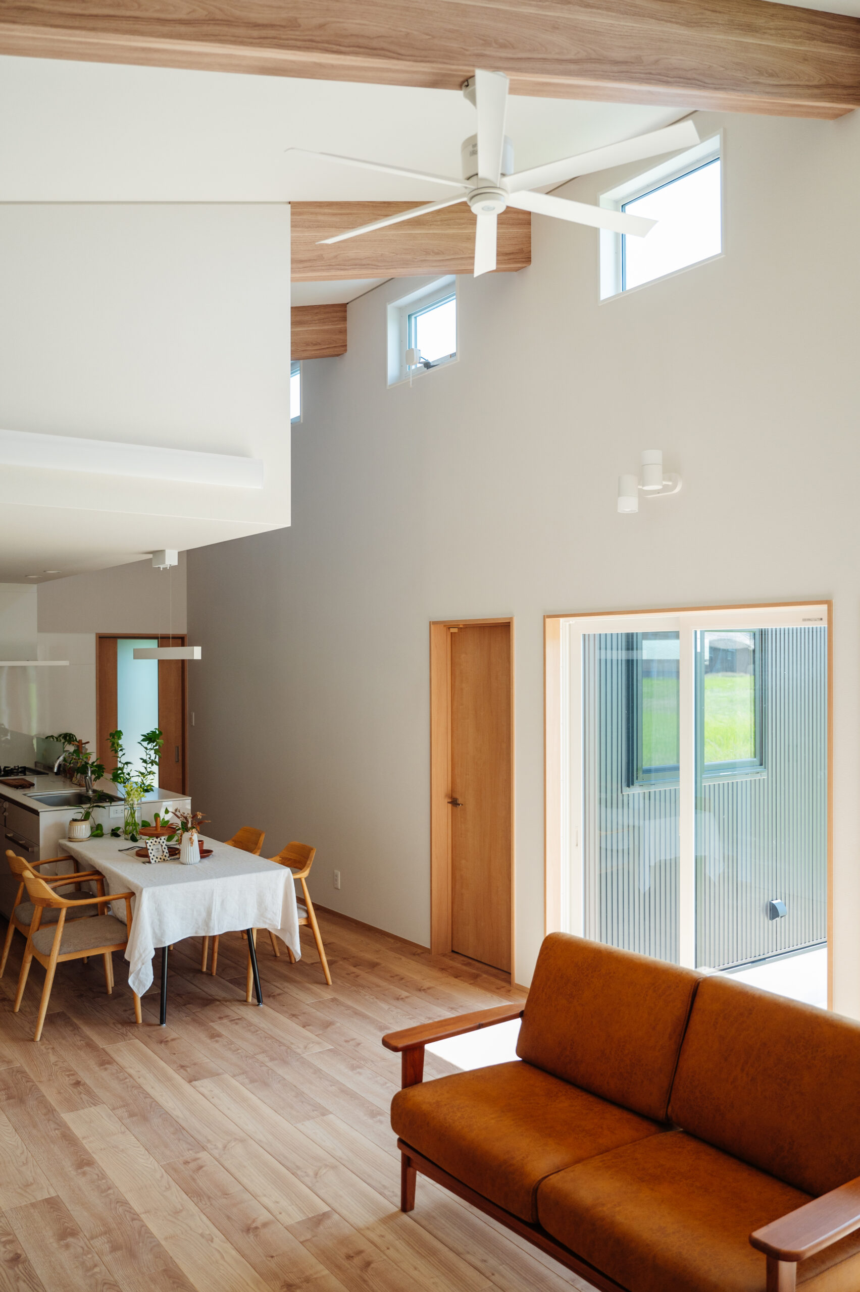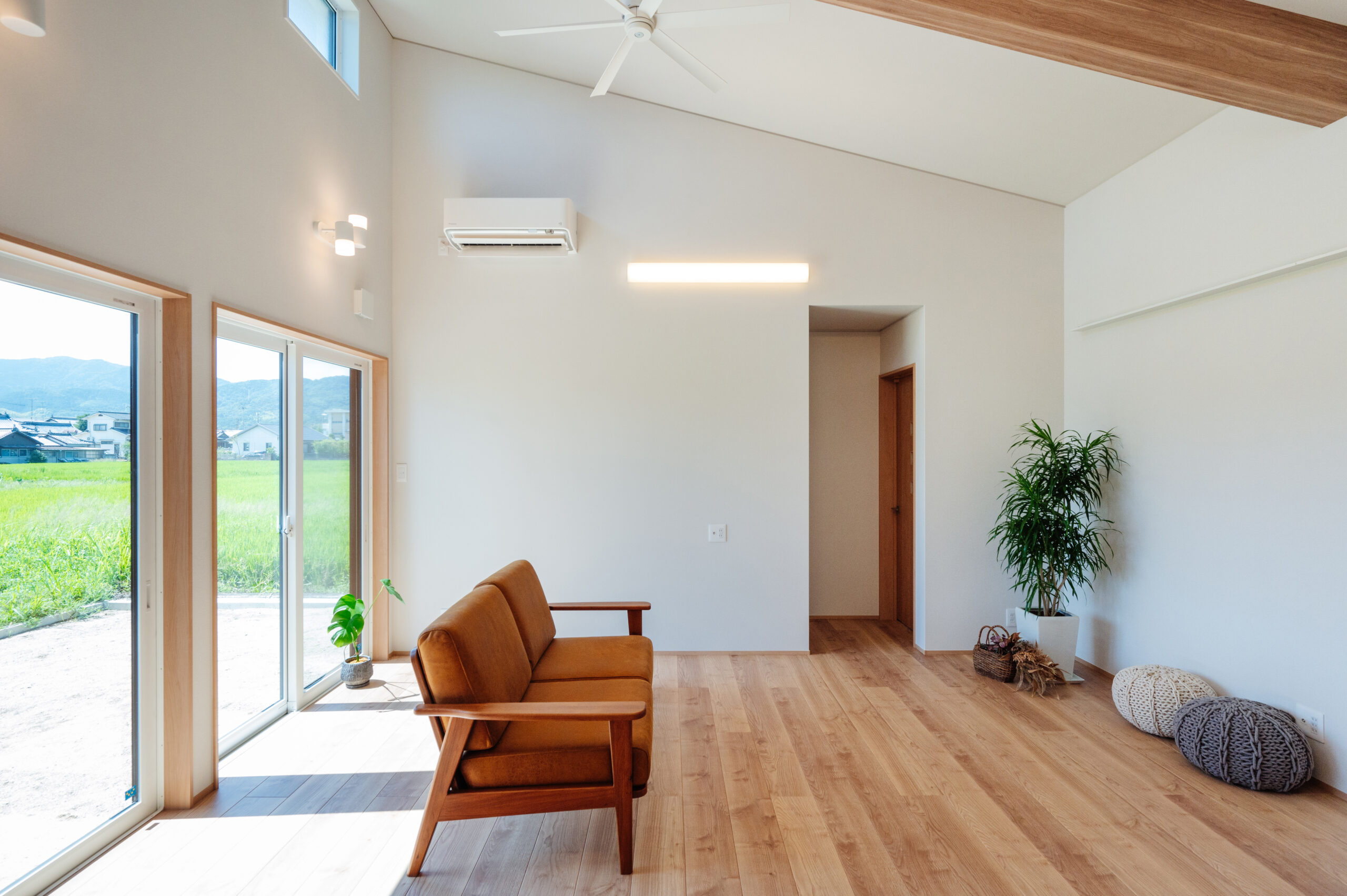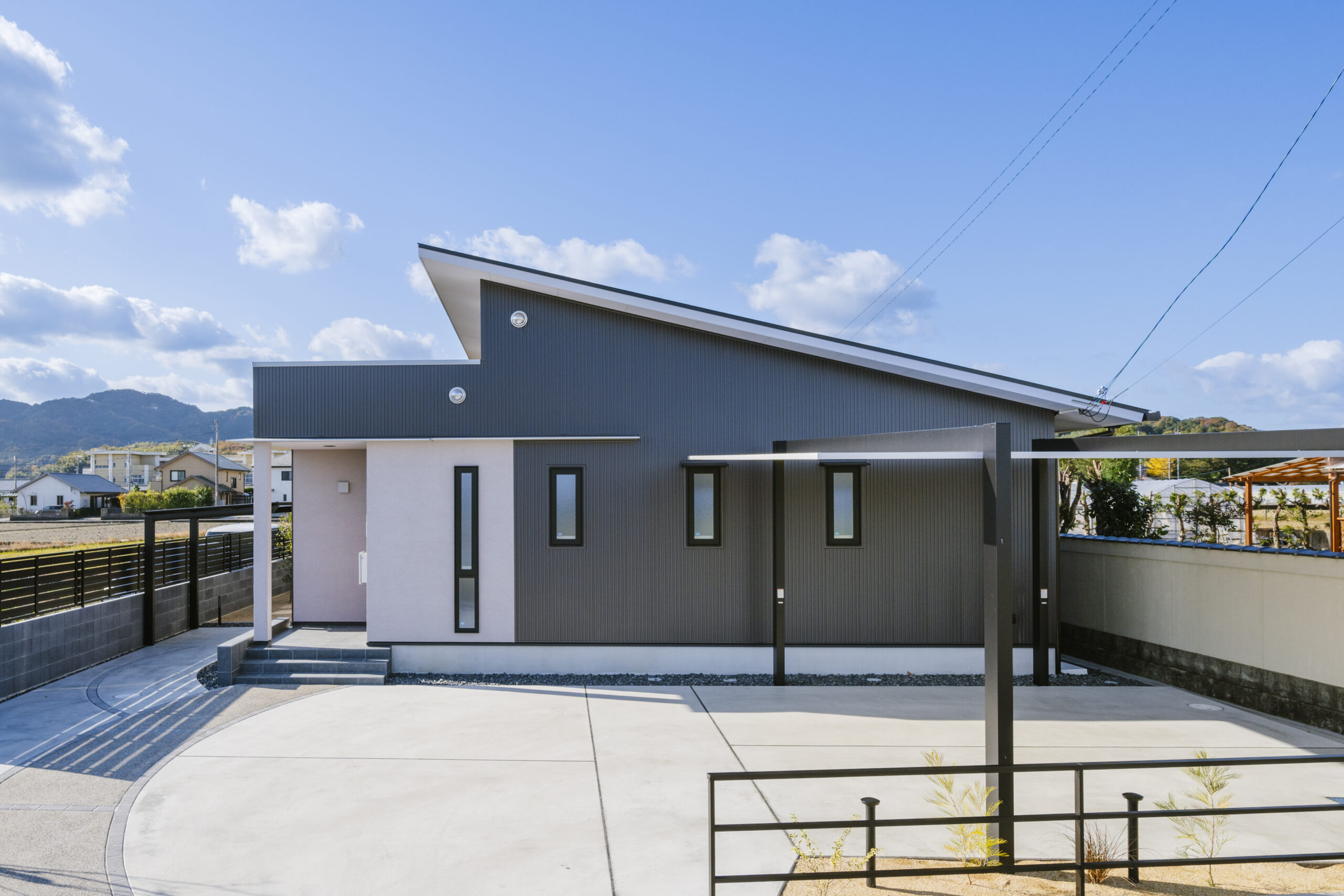 2024年10月29日 施工実績 光と開放感を楽しむ、斜め屋根の平屋住宅 この平家住宅は 斜め屋根デザインと大きな窓によって 自然光が豊富に差し込み、明るく開放的な空間を実現しました。 高い天井と白い壁・程よく見える木目が 温かみのある居心地の良い雰囲気を演出しています。