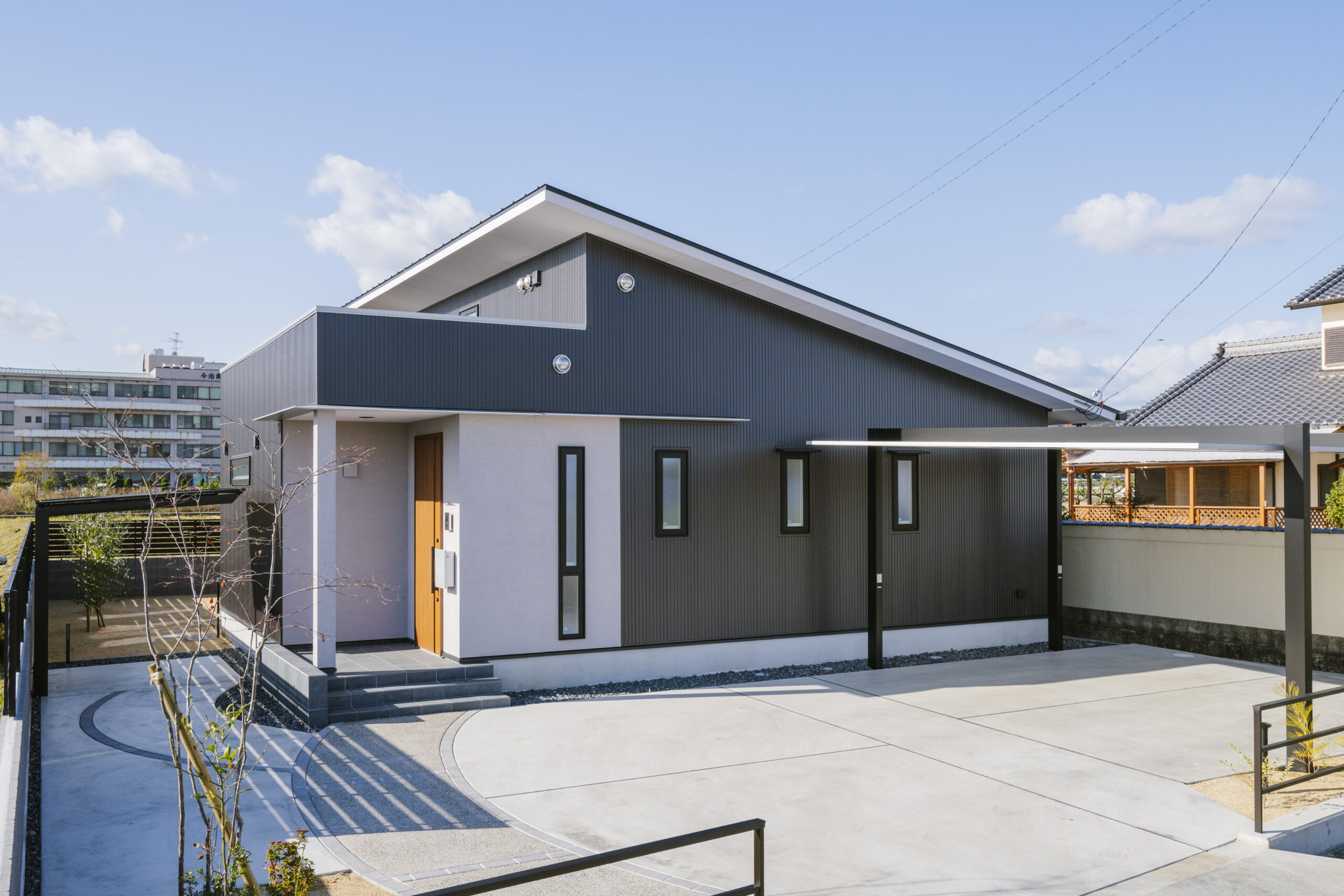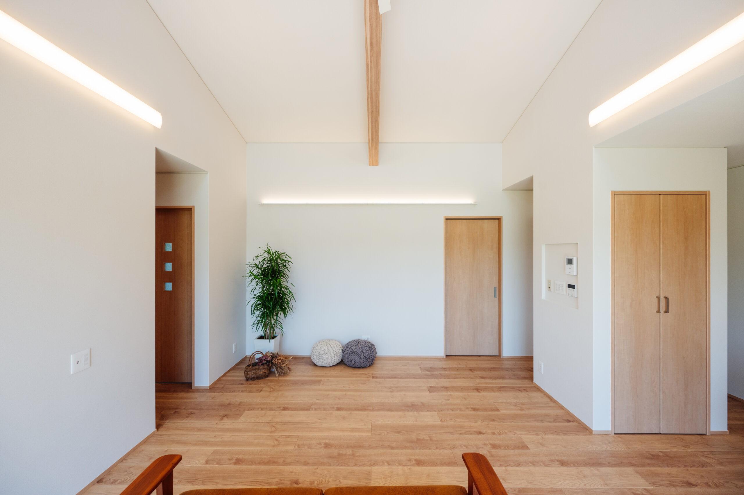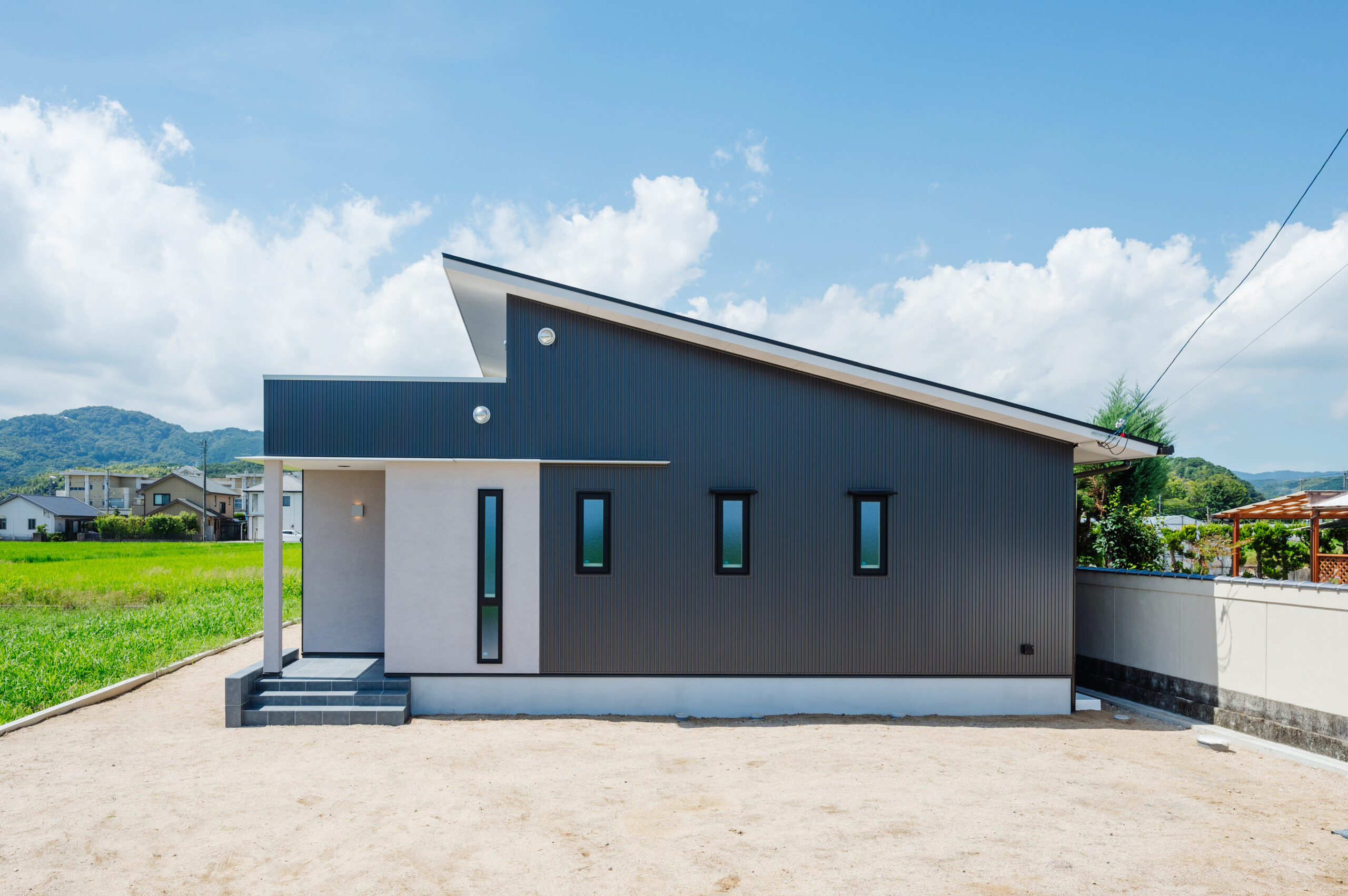 2024年10月29日 施工実績 光と開放感を楽しむ、斜め屋根の平屋住宅 この平家住宅は 斜め屋根デザインと大きな窓によって 自然光が豊富に差し込み、明るく開放的な空間を実現しました。 高い天井と白い壁・程よく見える木目が 温かみのある居心地の良い雰囲気を演出しています。