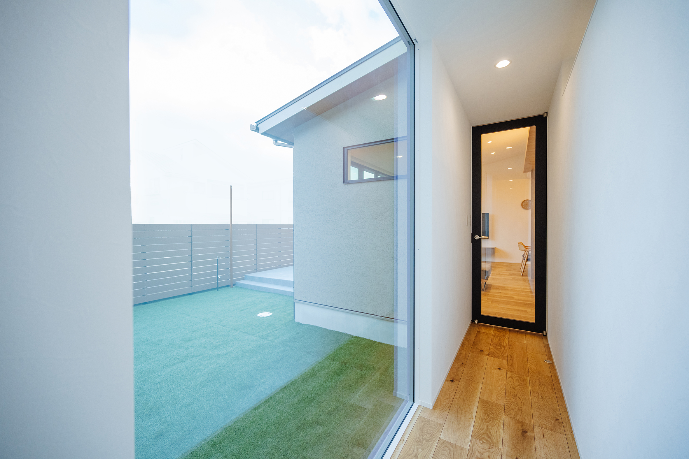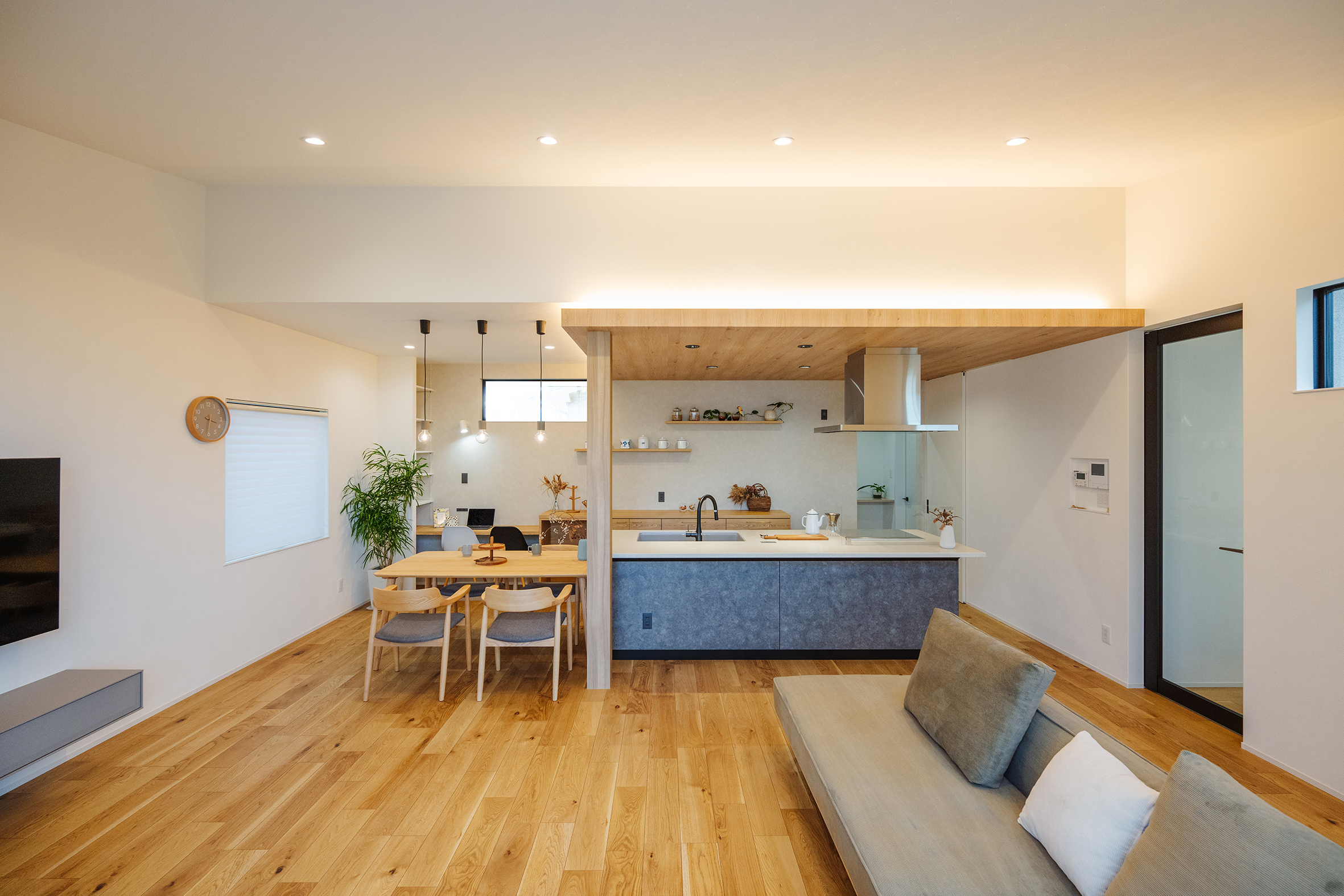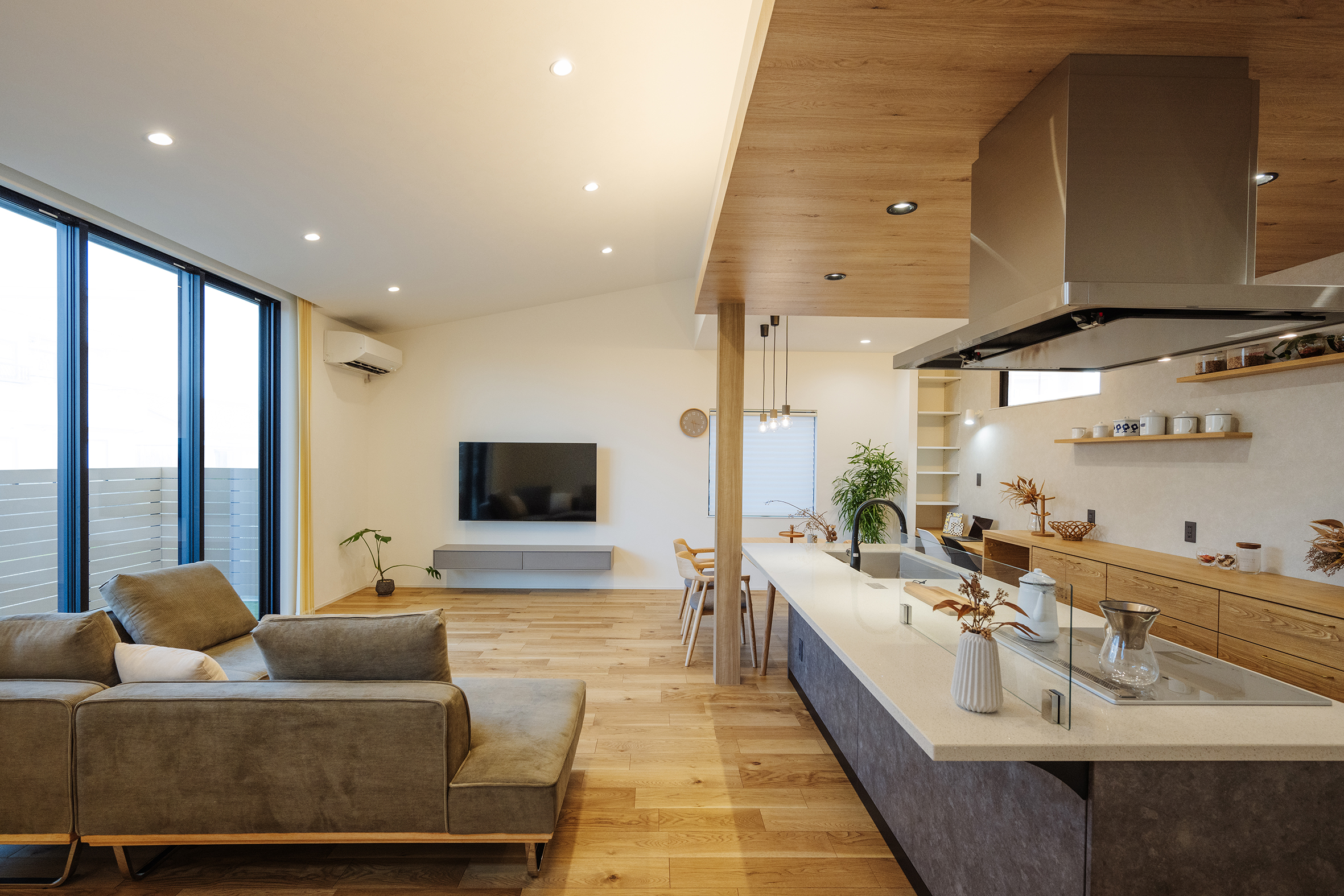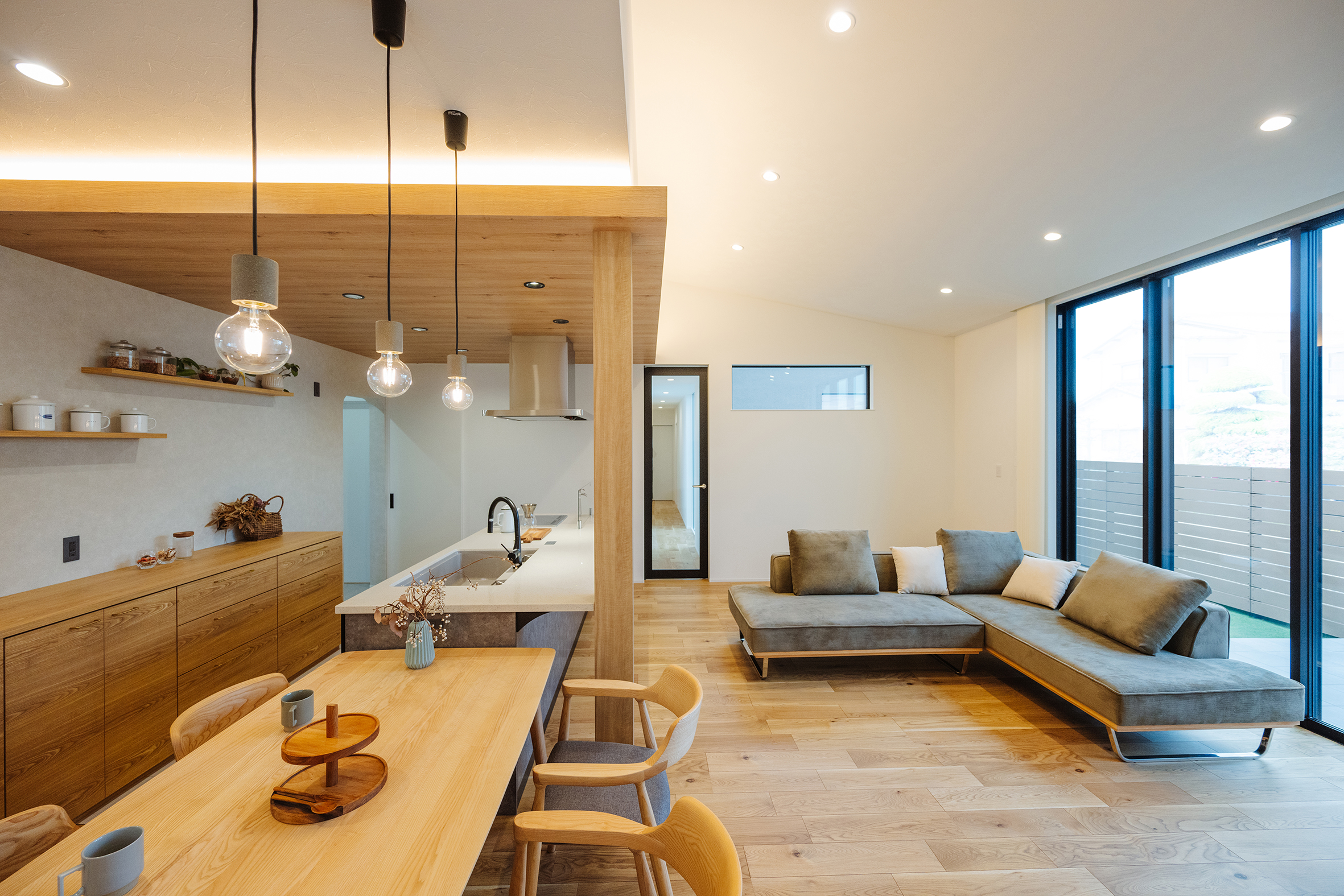 2025年2月20日 施工実績 こだわり抜いた和モダンの家 幼い頃からの想いが形になった 「こだわり抜いた家」 離れのような和室には間接照明を設け 雰囲気あふれる空間になりました。 客間として使っていただく時に、招いたお客様に気を使わず使っていただきたい。 というお施主様の想いにより、あえてリビングとは離した設計になりました。 廊下には、天井までの 大きなフィックス窓を設け 抜け感、透け感を意識し、 圧迫感のない廊下に仕上がりました。 その先には家族が集まる 開放感あふれるリビング。 勾配天井にしたことで、 さらに広く見せ開放的な空間になりました。 また、掃き出し窓を大きく設け、外のタイルデッキとリビングが一体感のある空間に なり、リビングのどこに居ても外で遊ぶ子供の様子が確認できるようにしました。