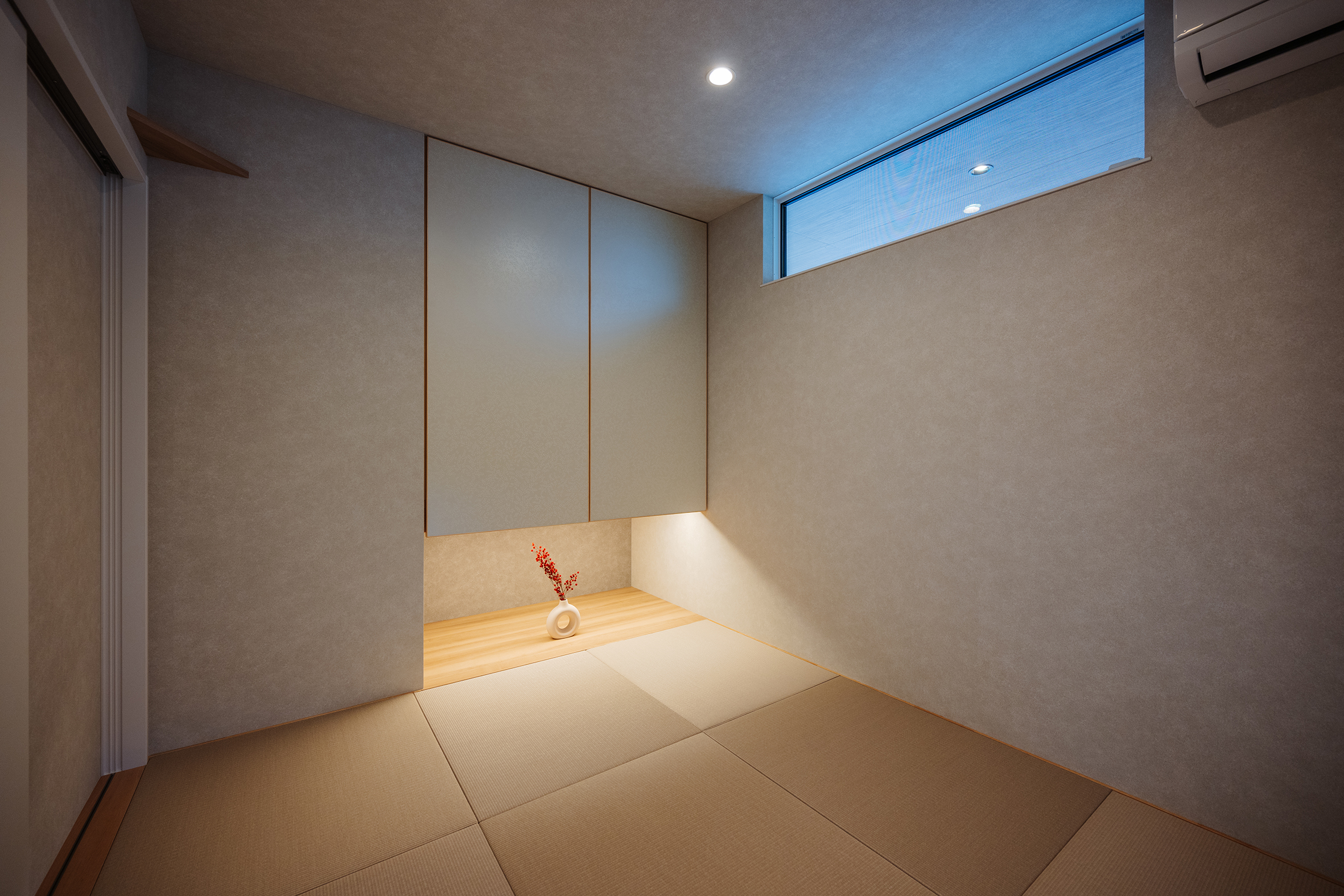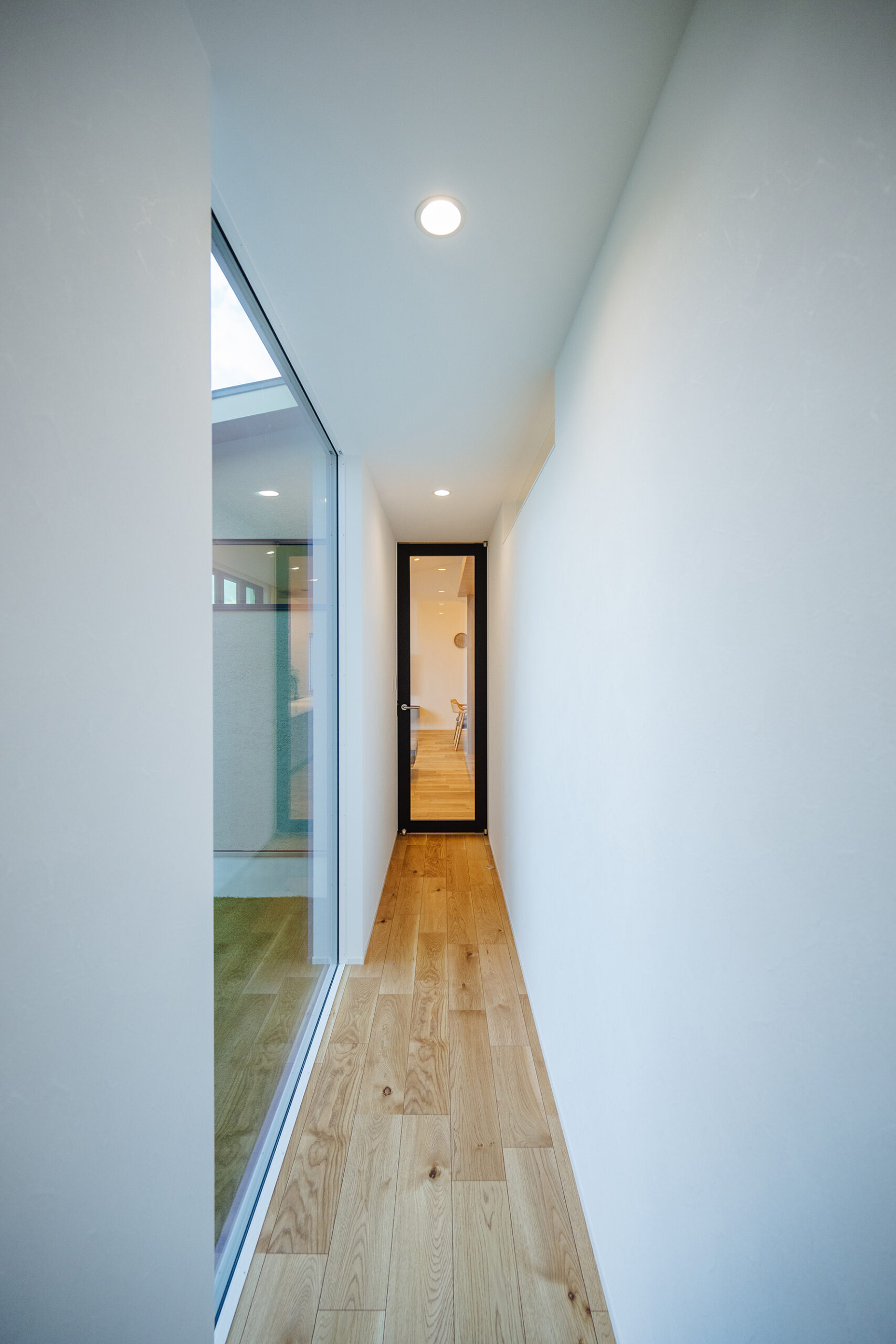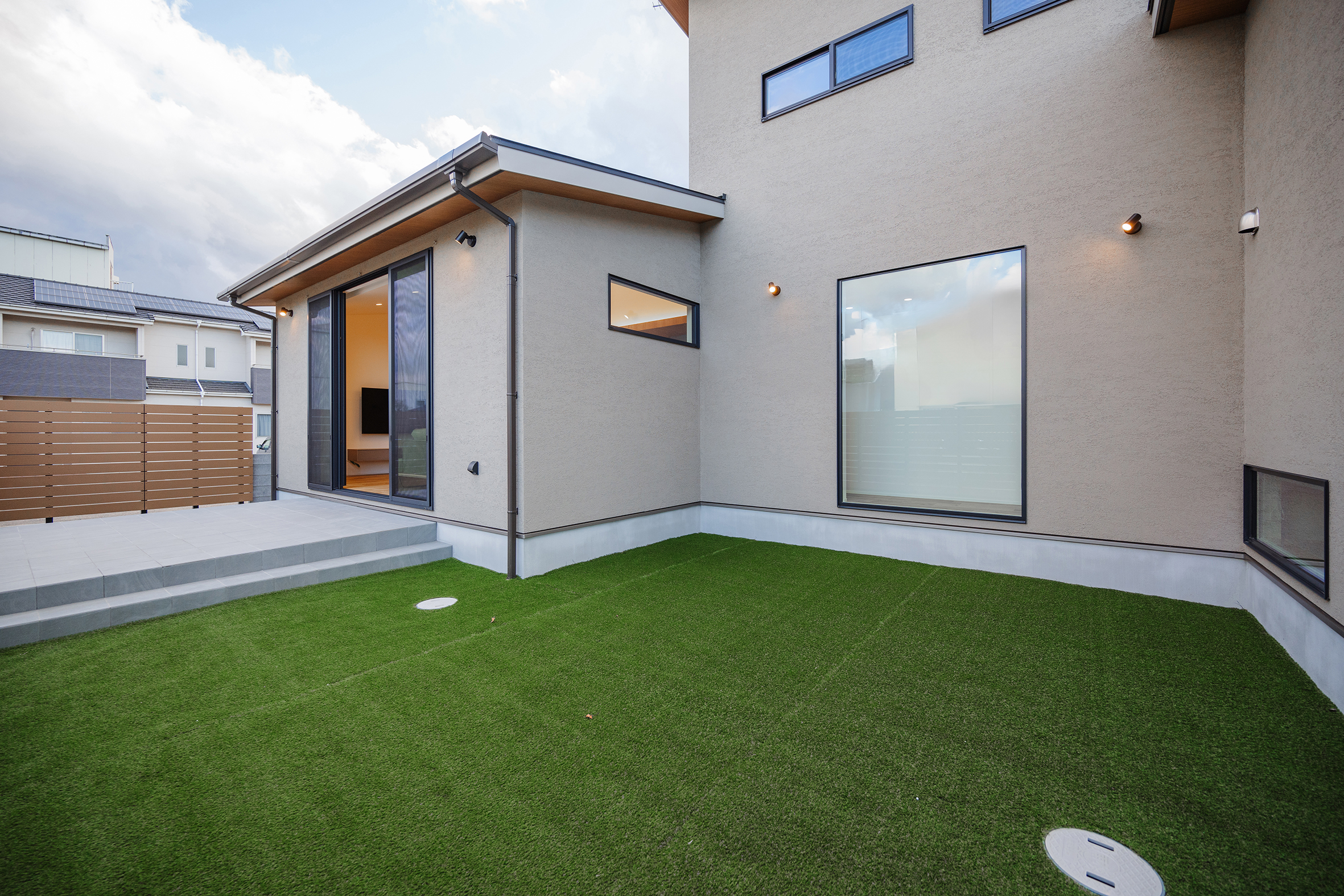 2025年2月20日 施工実績 こだわり抜いた和モダンの家 幼い頃からの想いが形になった 「こだわり抜いた家」 離れのような和室には間接照明を設け 雰囲気あふれる空間になりました。 客間として使っていただく時に、招いたお客様に気を使わず使っていただきたい。 というお施主様の想いにより、あえてリビングとは離した設計になりました。 廊下には、天井までの 大きなフィックス窓を設け 抜け感、透け感を意識し、 圧迫感のない廊下に仕上がりました。 その先には家族が集まる 開放感あふれるリビング。 勾配天井にしたことで、 さらに広く見せ開放的な空間になりました。 また、掃き出し窓を大きく設け、外のタイルデッキとリビングが一体感のある空間に なり、リビングのどこに居ても外で遊ぶ子供の様子が確認できるようにしました。
